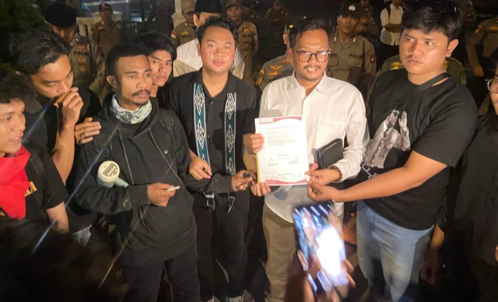 Anggota DPRD Batam Anwar Anas, berkemeja putih, saat didesak mahasiswa dalam aksi 24 Maret 2025 agar menghadirkan Endipat Wijaya ke Batam. Foto: Arsip mahasiswa