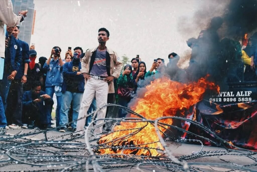 Jamaluddin Lobang (berkemeja cokelat) berdiri di depan kobaran api saat mengikuti aksi massa di Batam. Foto: Fajar Ramadhon.