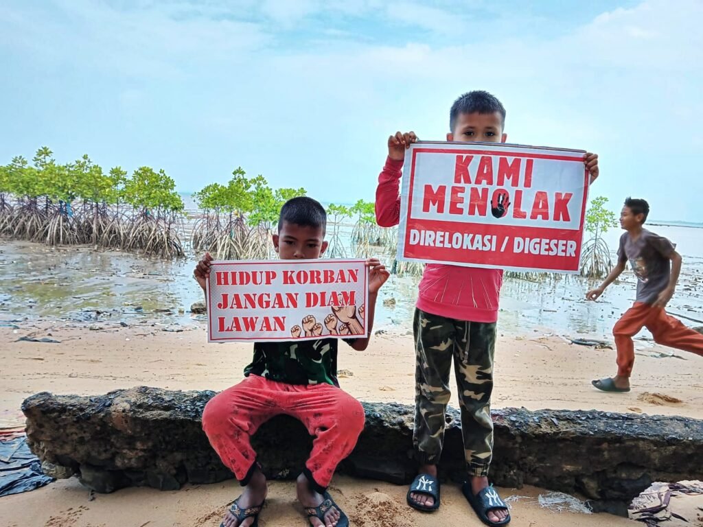 Di pesisir Sembulang, ketika orang-orang dewasa sibuk menyambut kedatangan Menteri Transmigrasi, sekelompok anak terlihat bermain di pantai. Mereka berlarian di atas pasir putih, membawa poster-poster penolakan yang dilipat agar tidak diterbangkan angin. Sebagian malu-malu ketika ditanya, tapi sebagian lain menjawab dengan percaya diri, seolah sudah mengerti apa yang sedang terjadi.