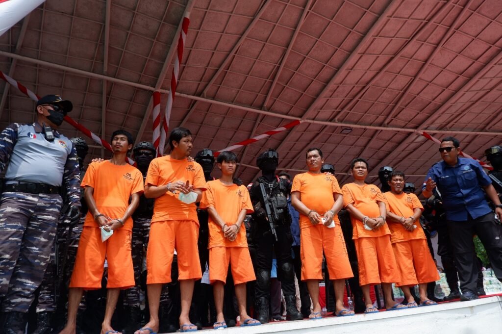 Lima tersangka kasus penyelundupan sabu-sabu dibawa ke atas panggung saat Pesta Rakyat Antinarkoba BNN di Batam. Foto: Yogi Eka Sahputra.